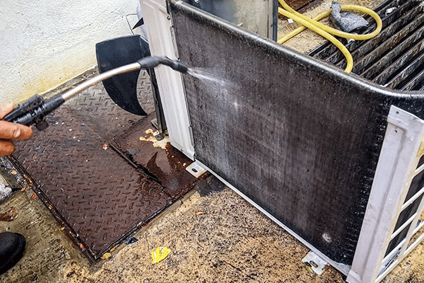 Flushing and cleaning drain pans and lines to prevent leakage, blockages, and water damage.